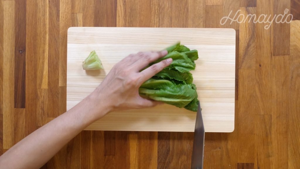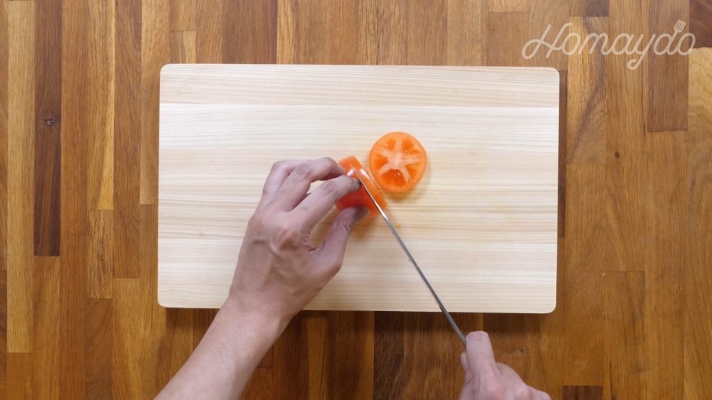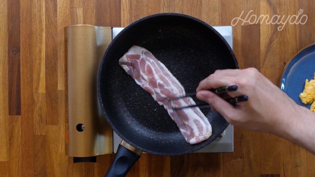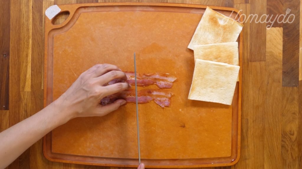 然後把煙肉撈起,用廚房紙吸乾油分,再一開為二