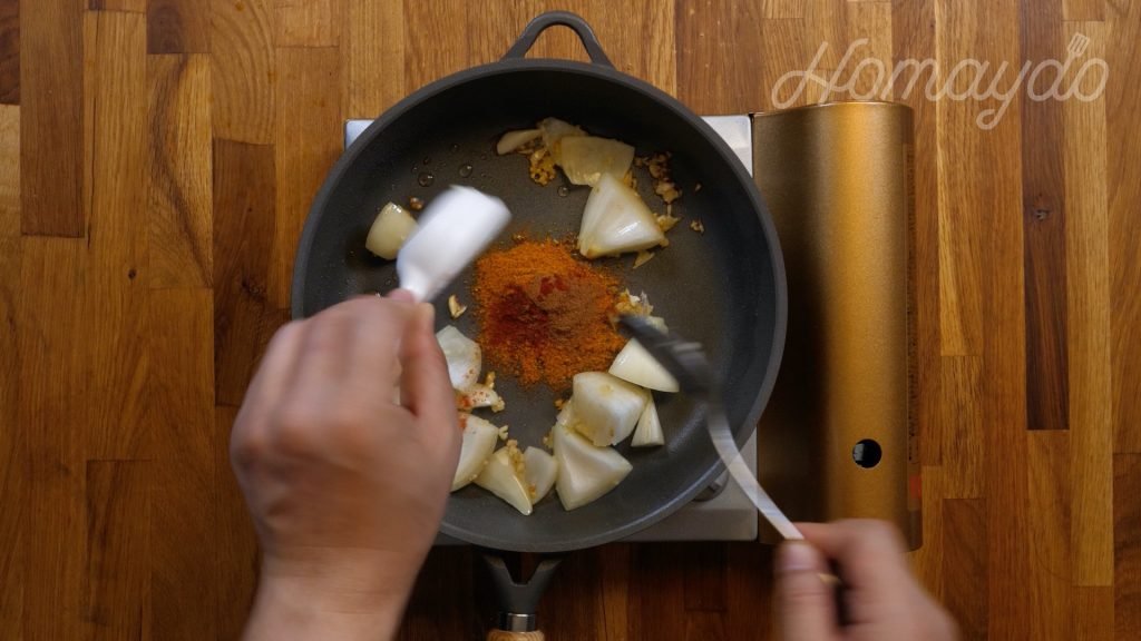 然後下月桂葉、咖喱粉、薑黃粉、肉桂粉和辣椒粉炒 1分鐘