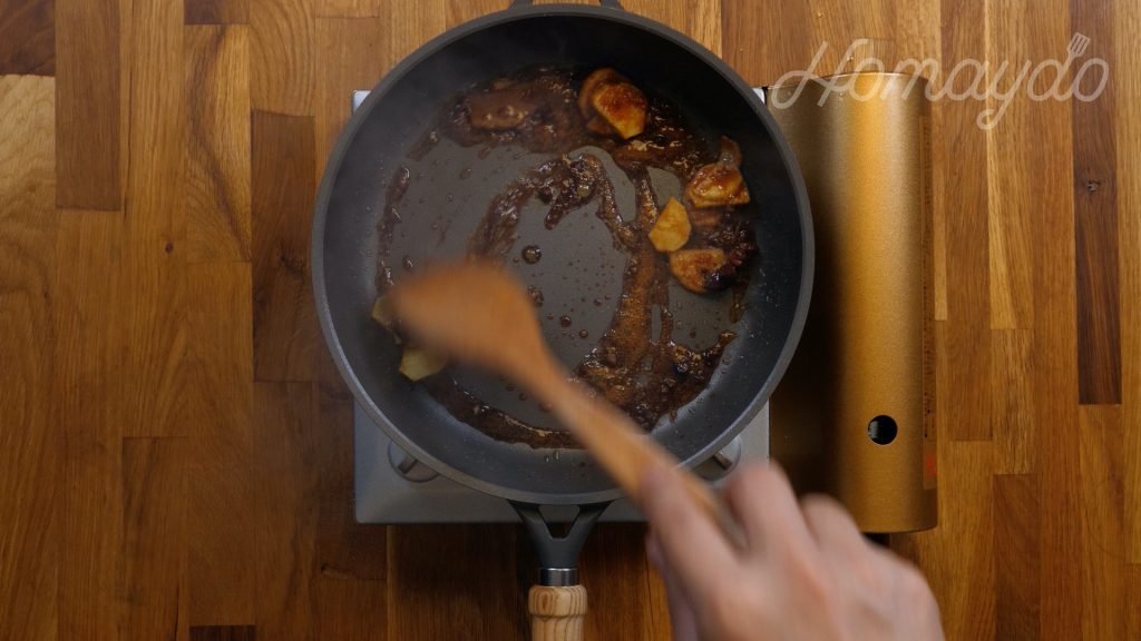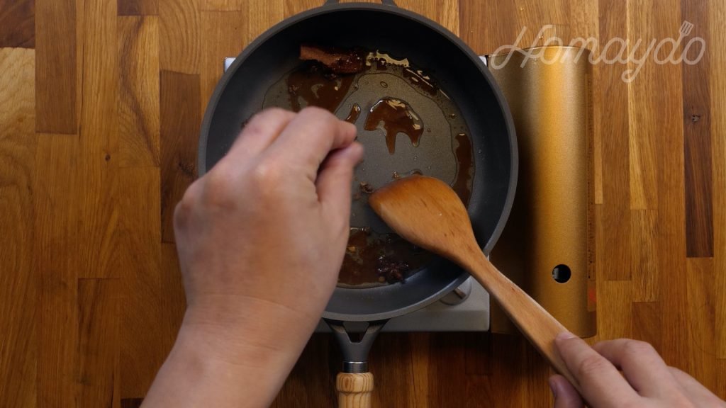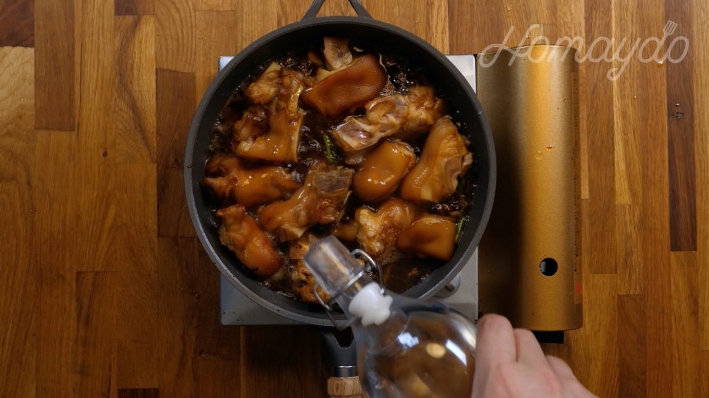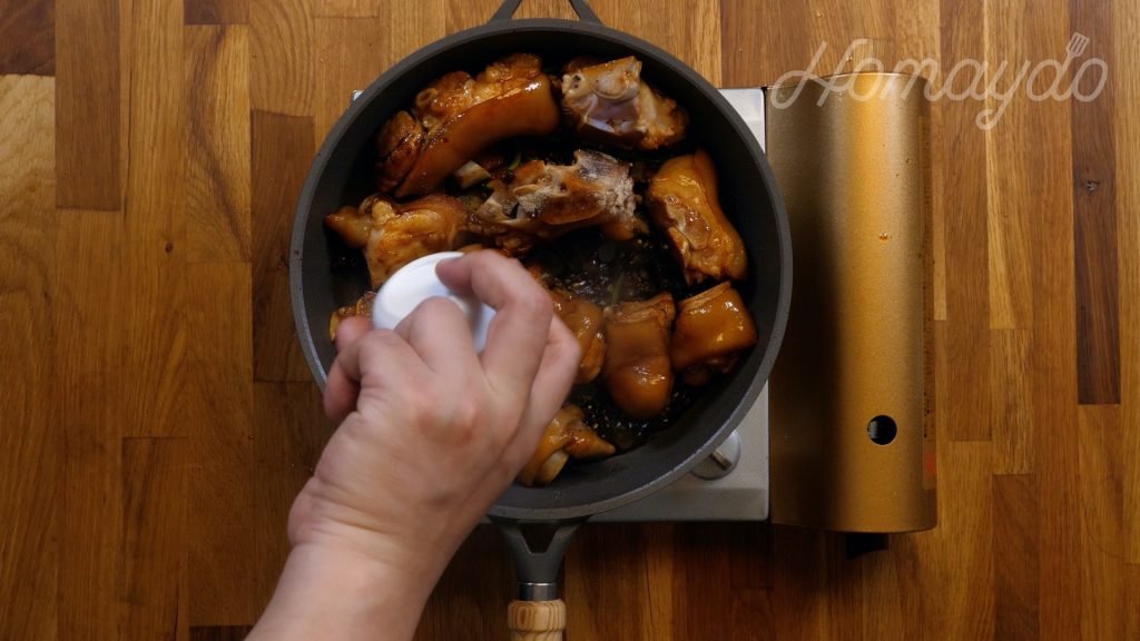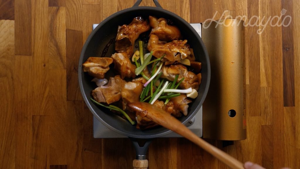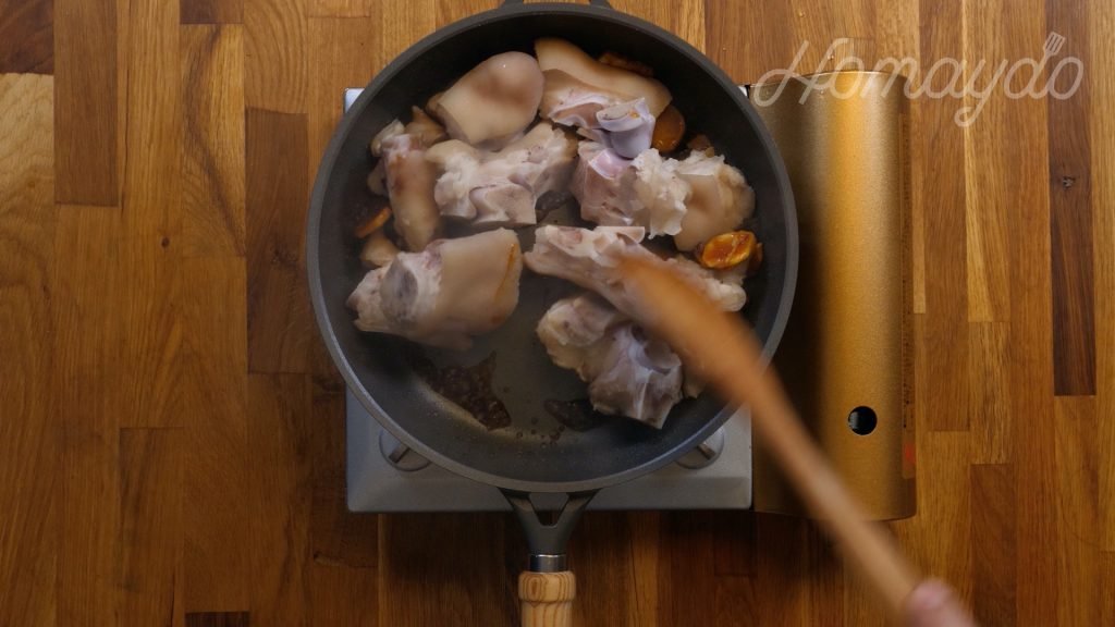 加入豬手炒1分鐘,令豬手沾上焦糖
