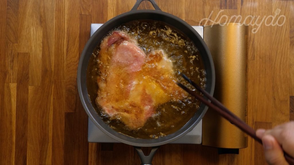 放入豬扒,每面炸2分鐘至9成熟