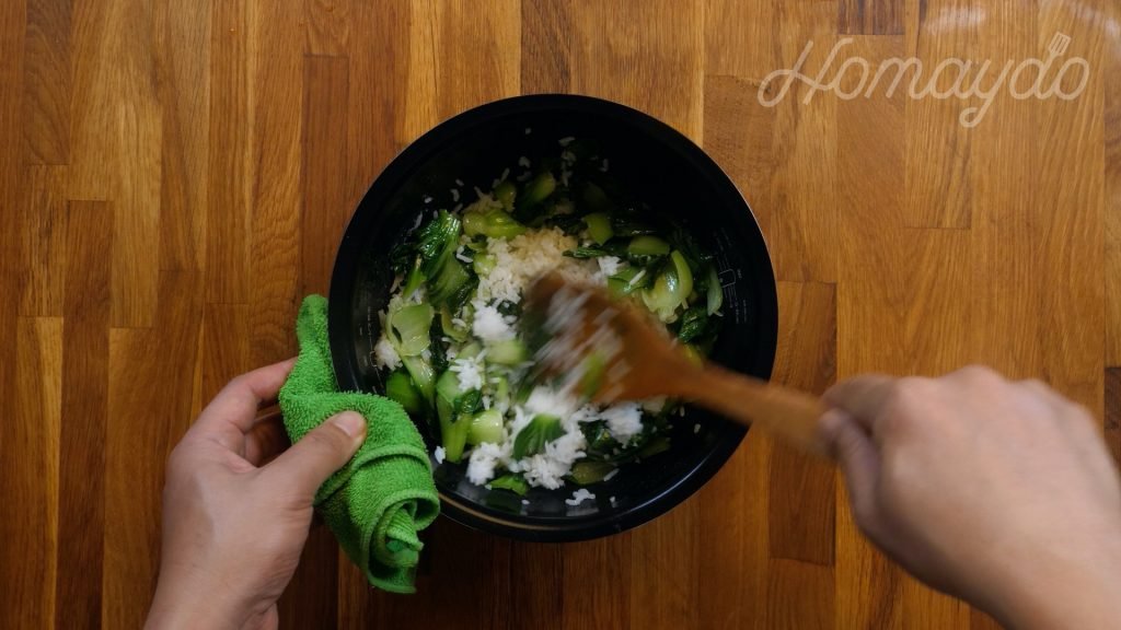 白米煮成熟飯後,拌入小棠菜就完成菜飯