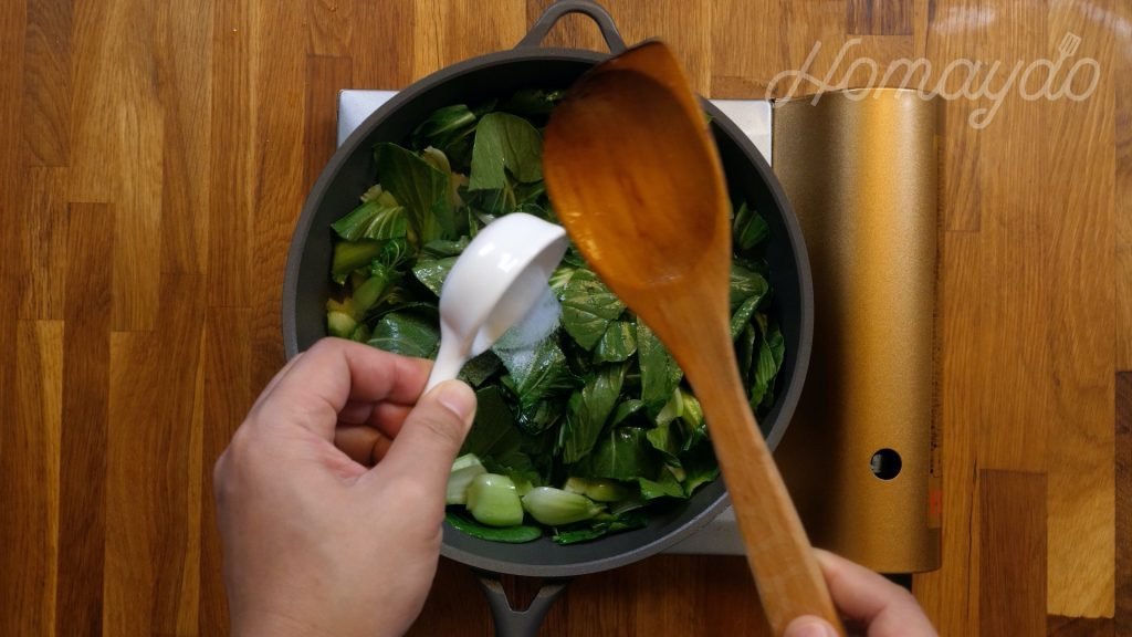 放入小棠菜炒至軟身,加入少許鹽調味備用