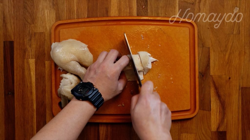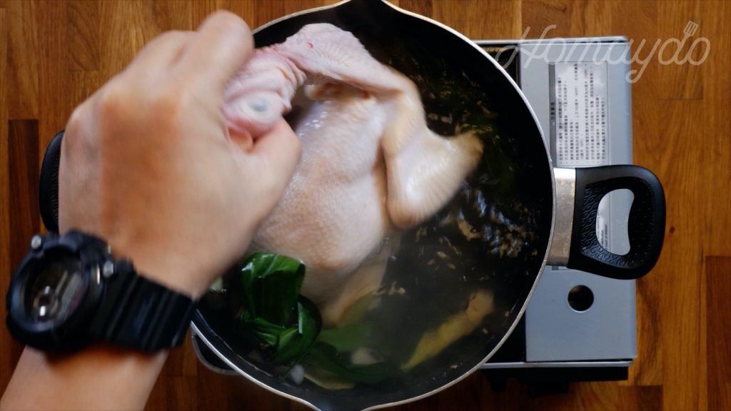 然後把雞放沸水中,再拿出重覆3-4次,就可以把雞完全放入水中,這樣做可令雞肉不會突然收縮影响肉質