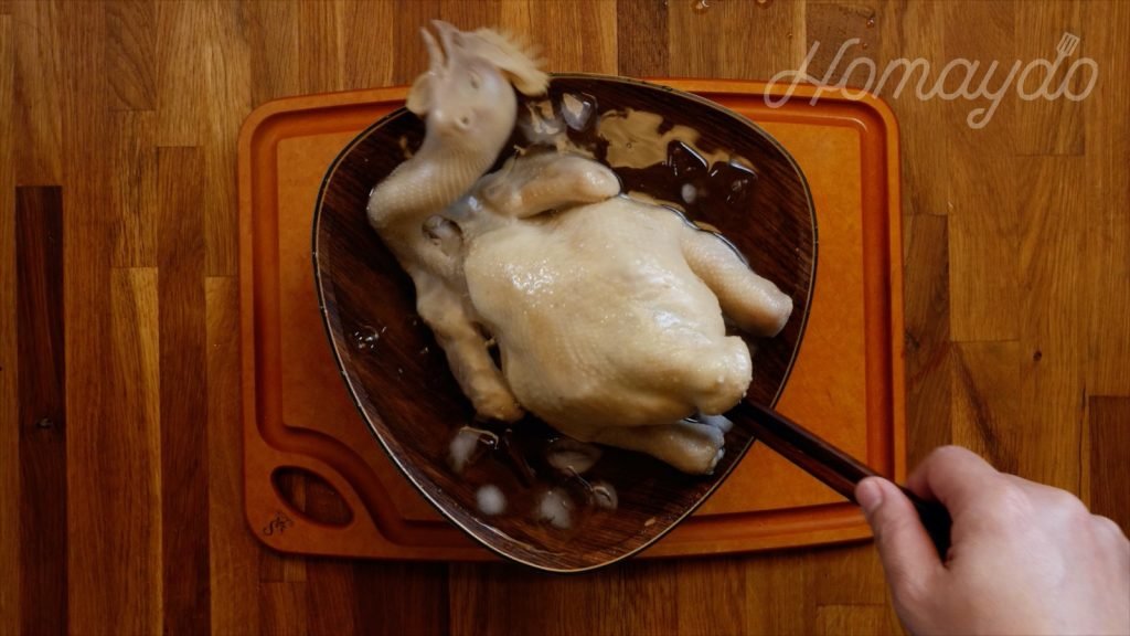預備一碗冰水,把雞放入,令雞肉收縮更有口感