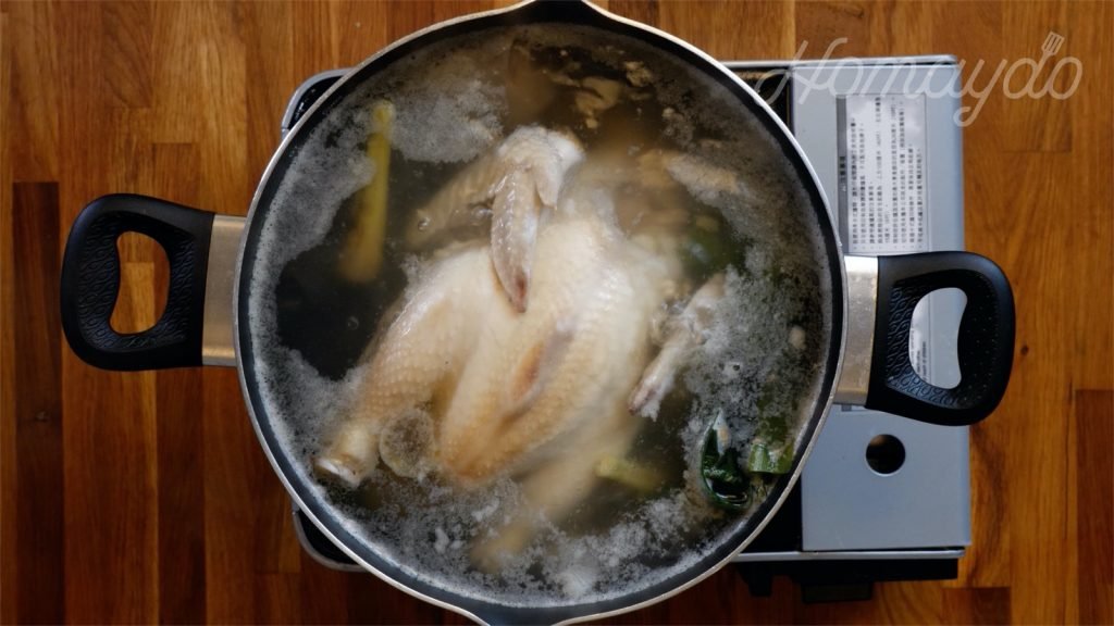 再把水煮至沸騰,然後就可以蓋上,視乎雞的大小,浸 25-30分鐘