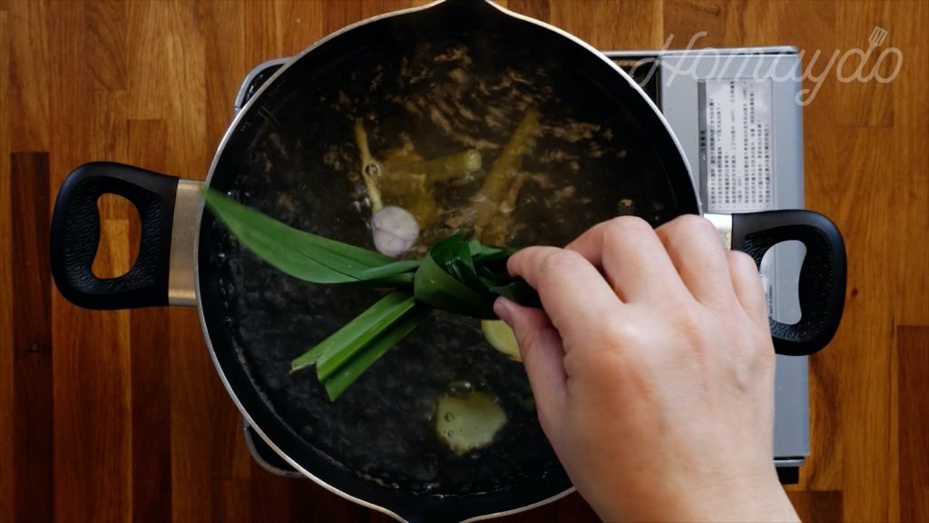 燒一煲大沸水放入香茅、薑片、蒜頭及班蘭葉煮 20分鐘至出味