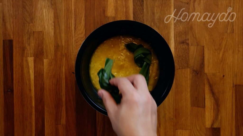 再加入班蘭葉,然後放進電飯煲煮約 1小時。不用特别處理,跟一般白飯做法就可以