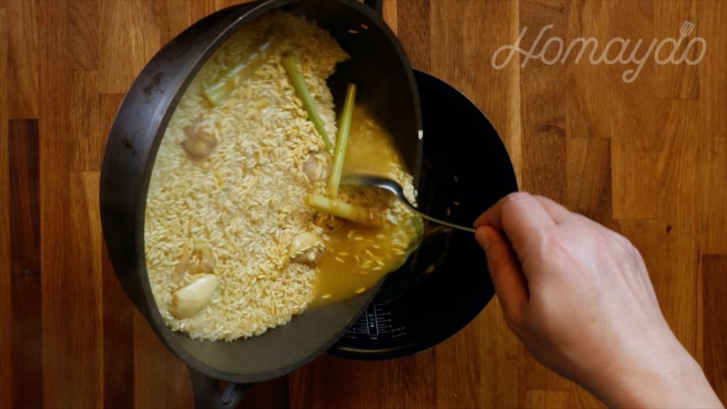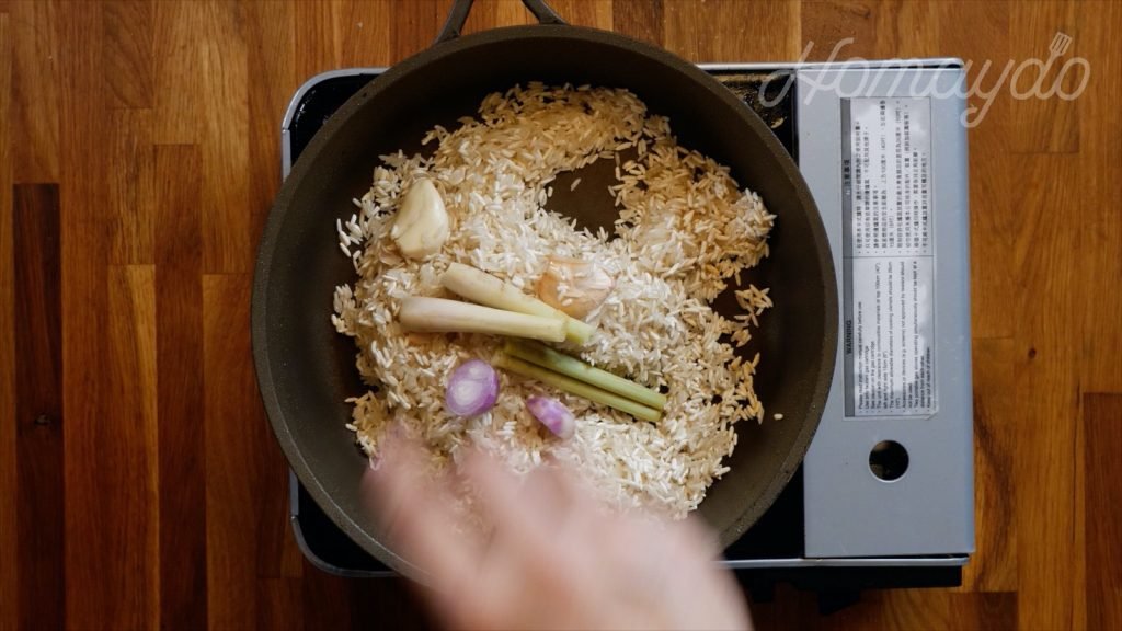 再加入香茅及紅蔥頭再炒勻