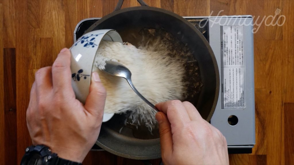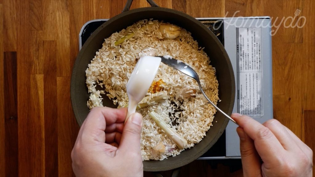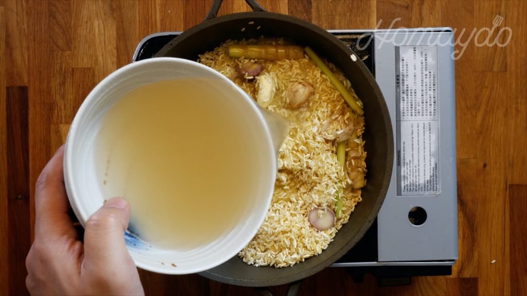 再倒入雞湯輕炒煮沸