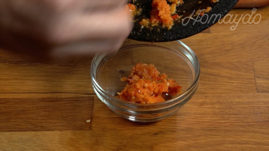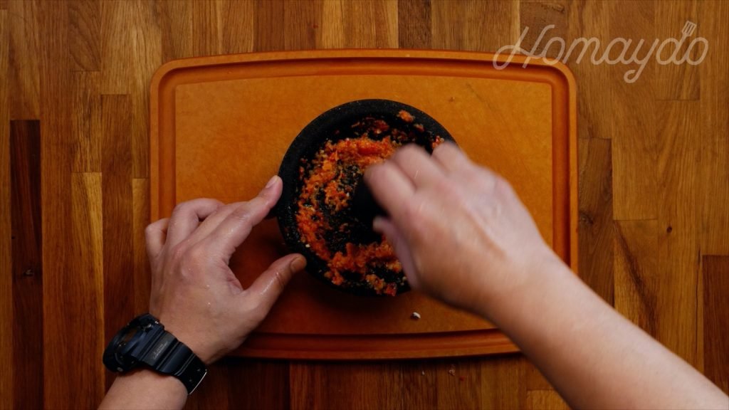 用一個石磨將準備好的蒜蓉、薑末及辣椒碎磨碎