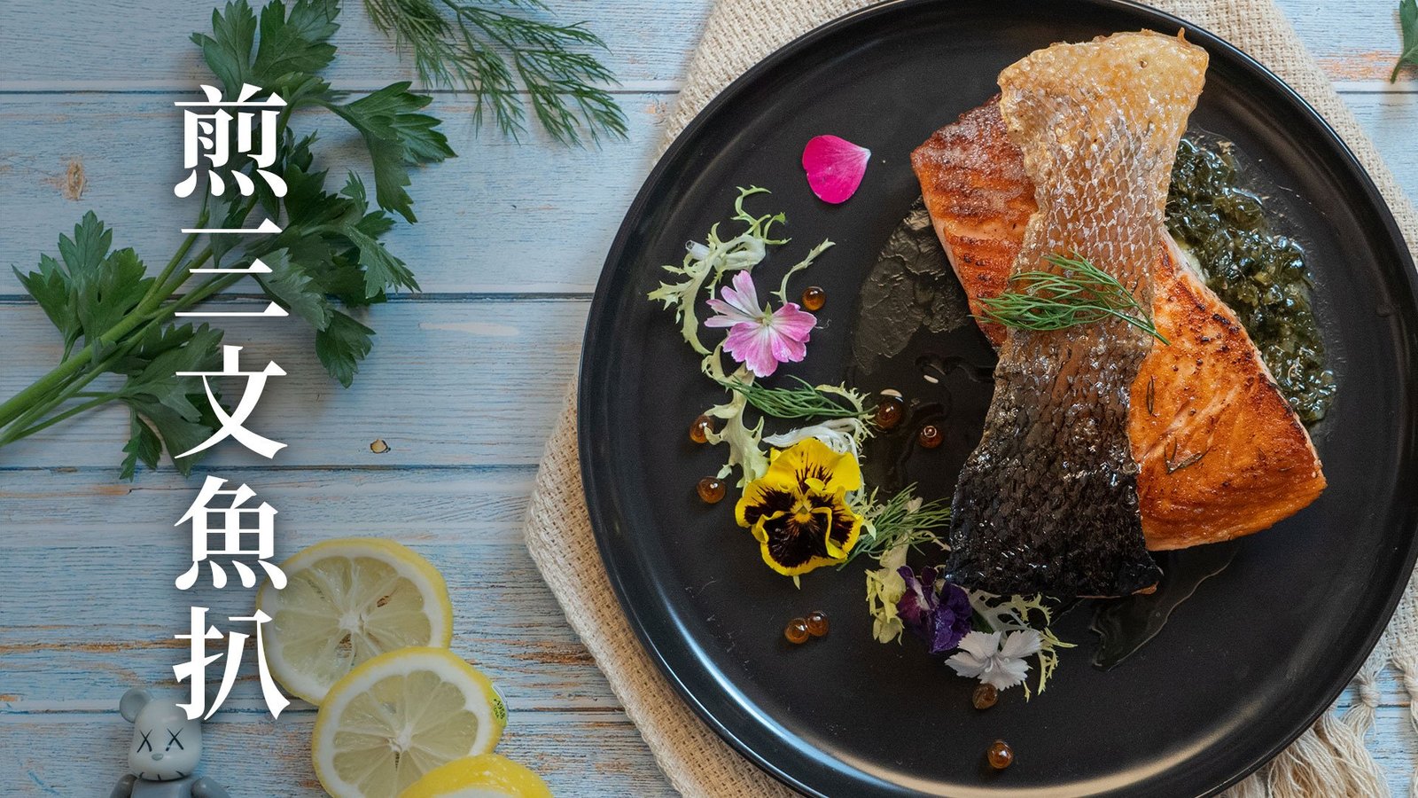 轉小火放入香草及牛油,反覆把牛油淋上三文魚上,令魚吸收牛油香味