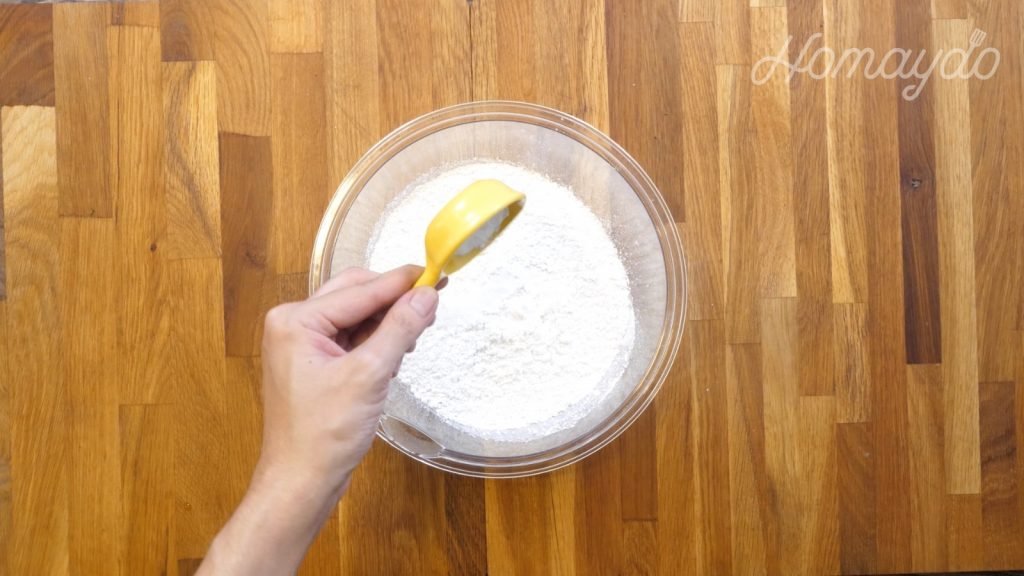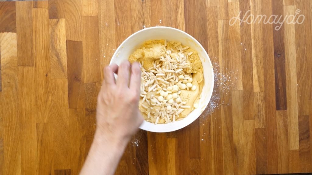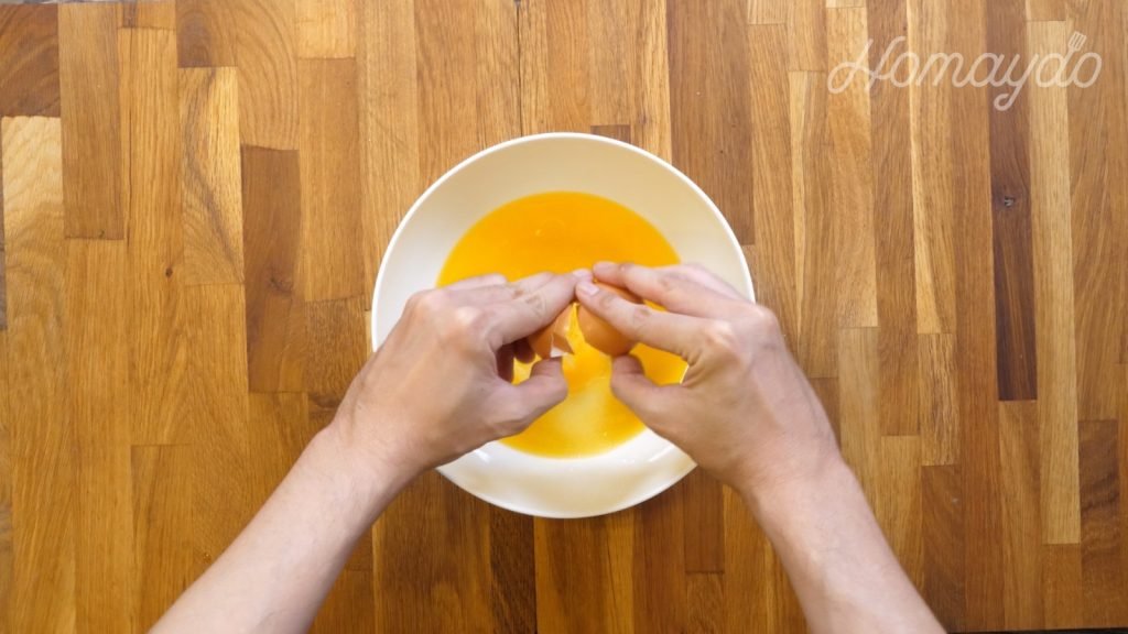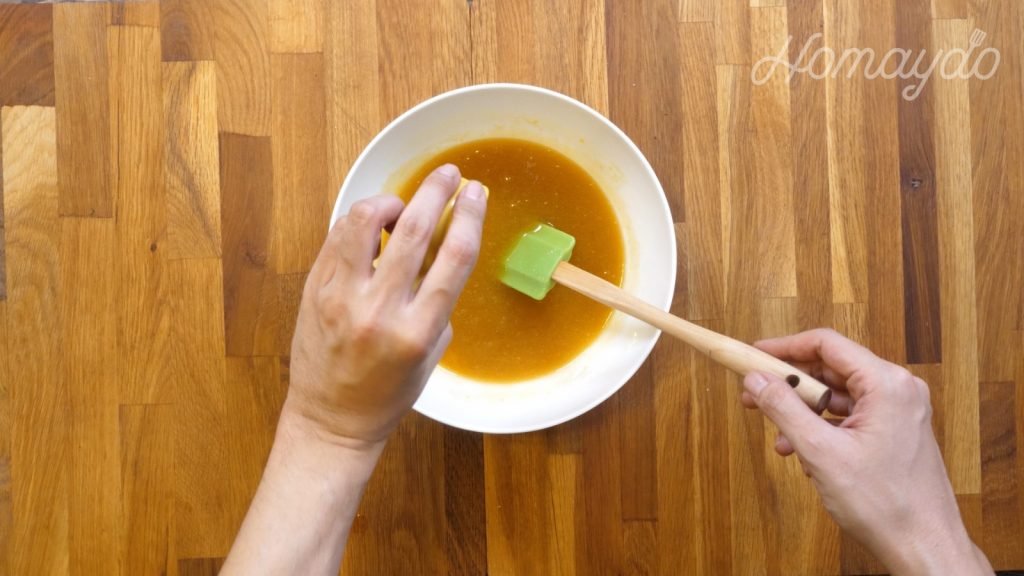 把白糖、黃糖、牛油及雞蛋加到碗裡拌勻