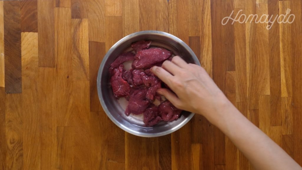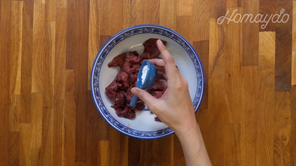 牛肉加入清水及梳打粉拌勻浸泡90分鐘