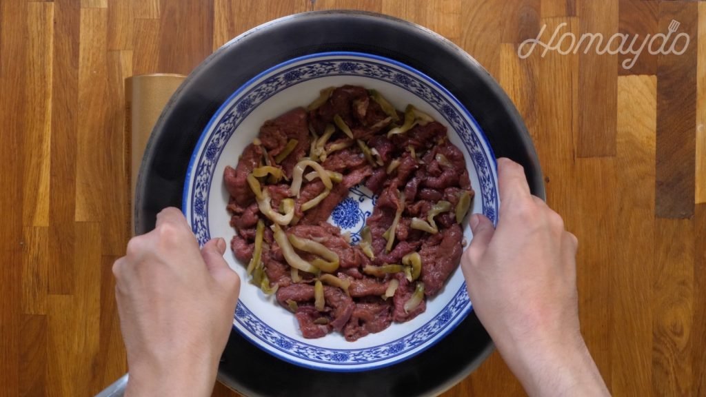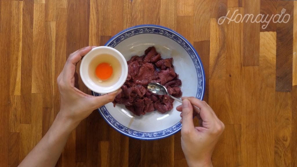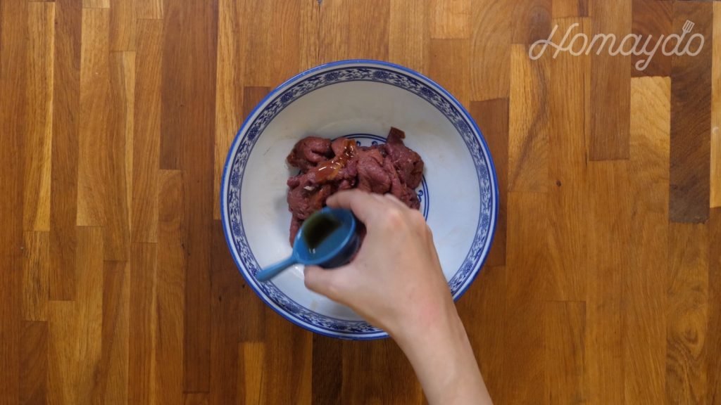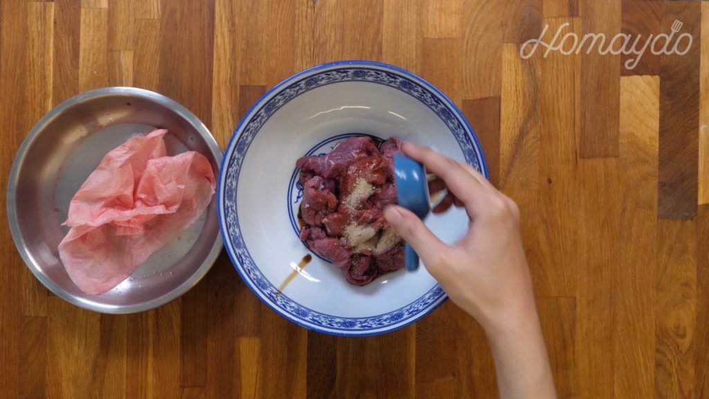 把牛肉放到碟裡加入紹興酒、鹽、生抽、白胡椒粉和糖拌勻