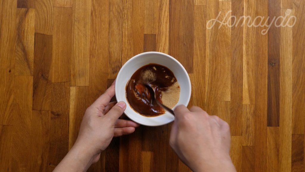 在碗內加入鹽、胡椒、甜椒粉、黃糖及燒烤醬拌勻