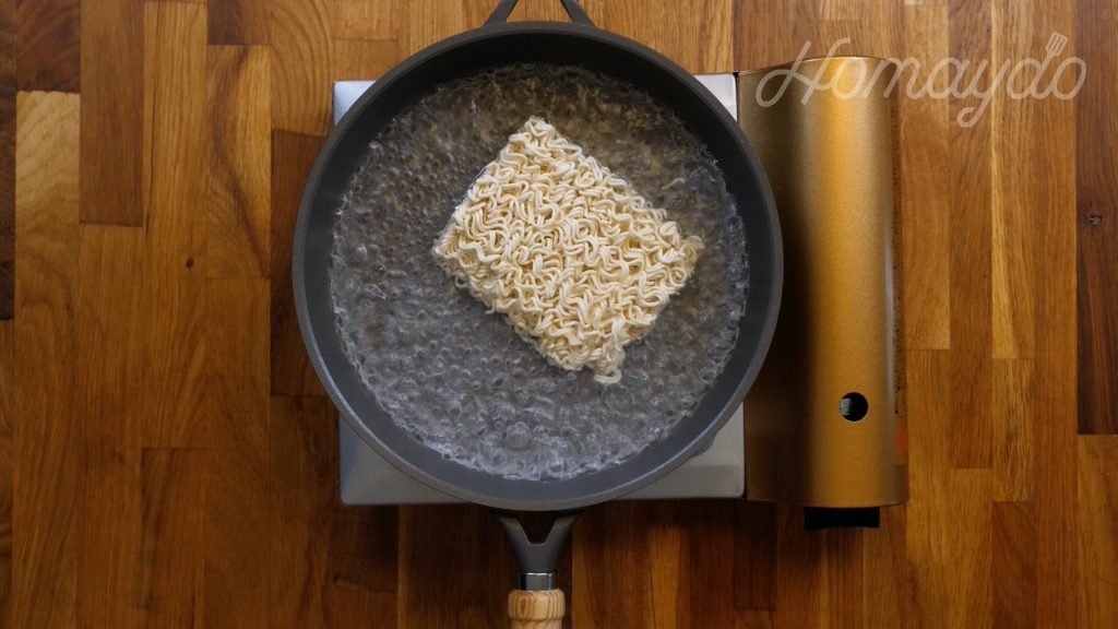 煮熱一鍋水,放入即食麵煮熟後瀝乾水分,放在碟上