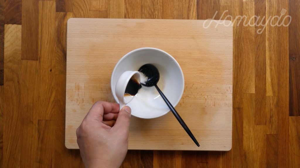 在碗內加入糖、生抽、老抽及生粉醃拌勻