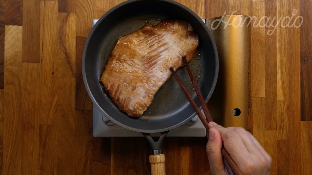放入豬頸肉每面各煎4分鐘