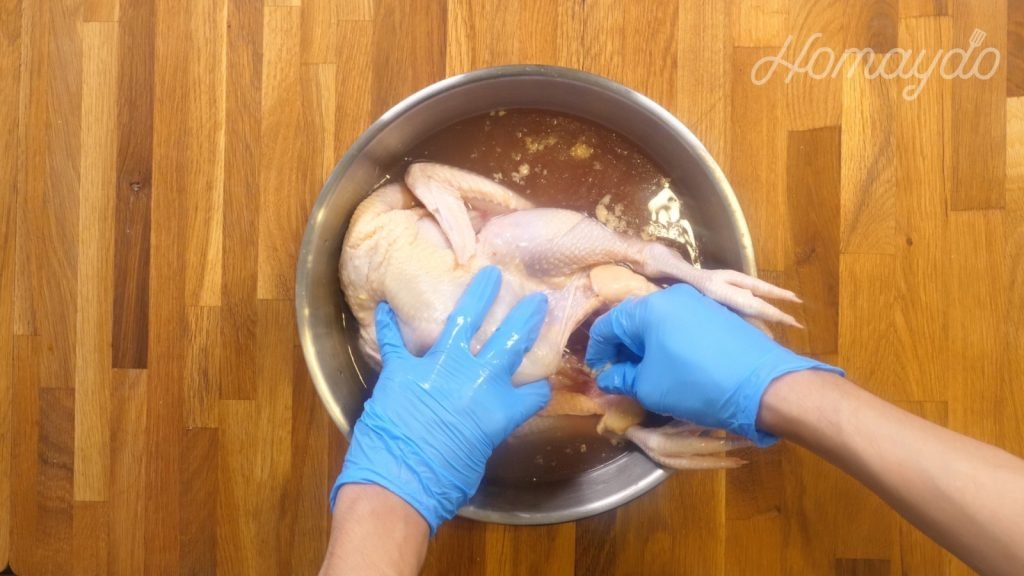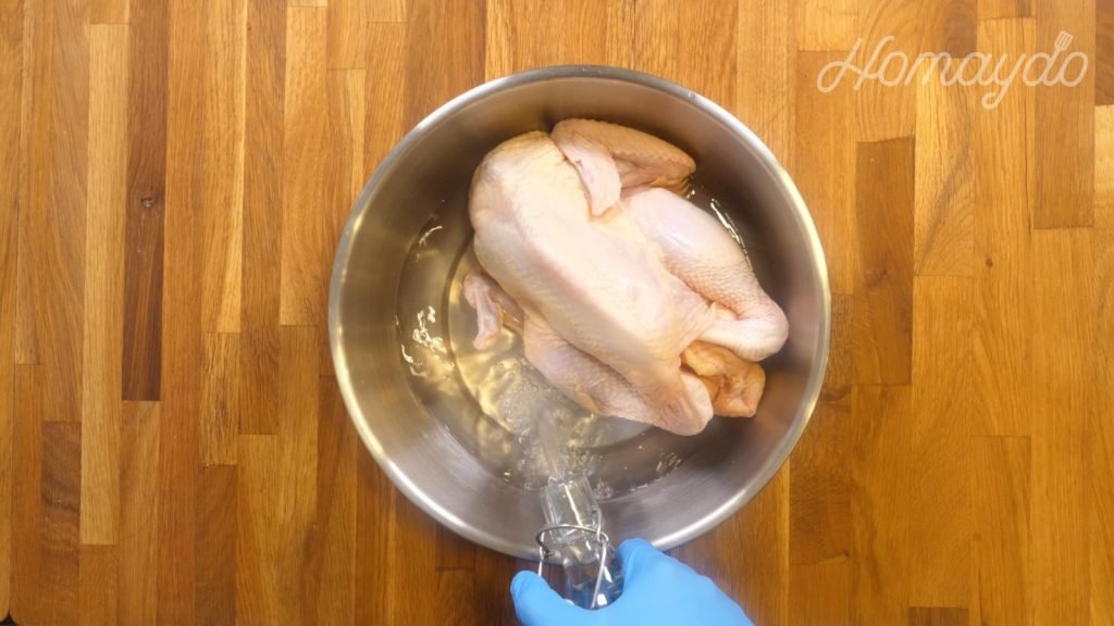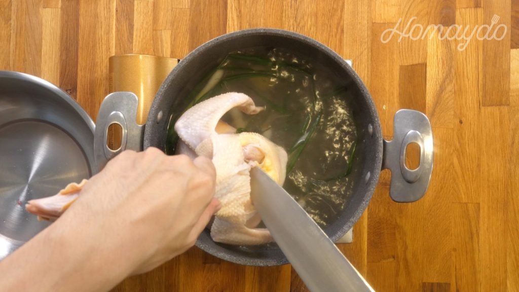 把雞完全浸泡,煮沸後關火,加蓋浸泡半小時