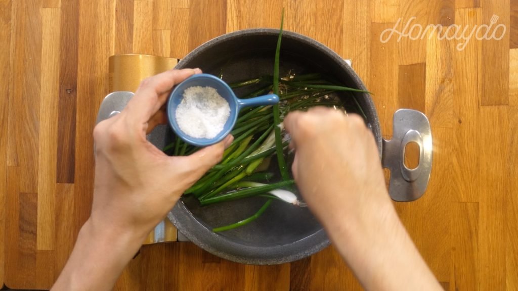 煮沸一鍋水加入薑片、蔥及一小撮鹽煮沸
