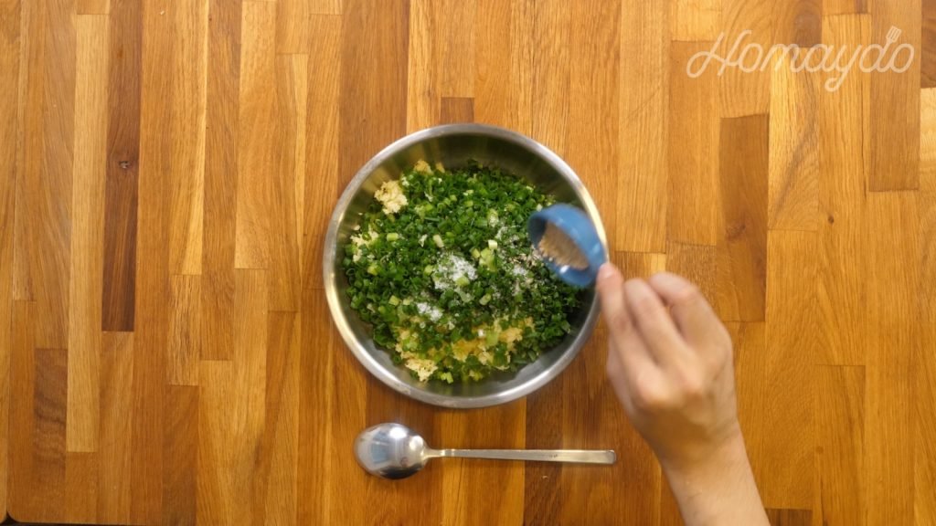 薑蔥加入鹽、沙薑粉及白胡椒粉拌勻