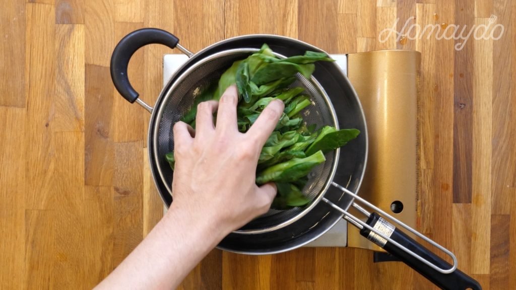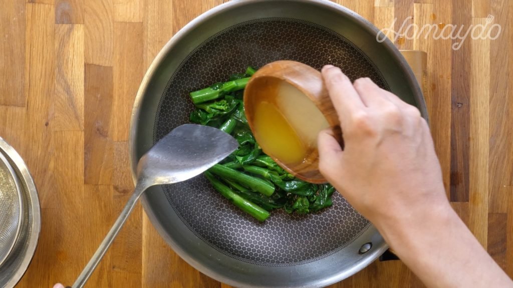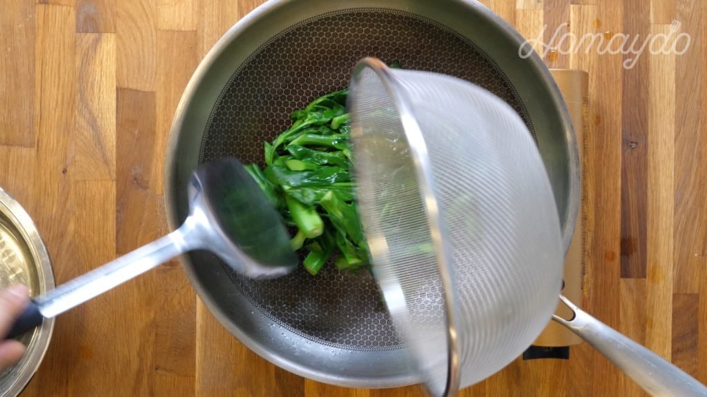 煮沸後放入芥蘭莖和葉煮15秒鐘
