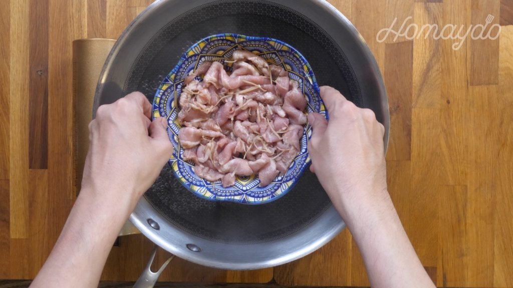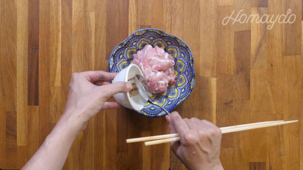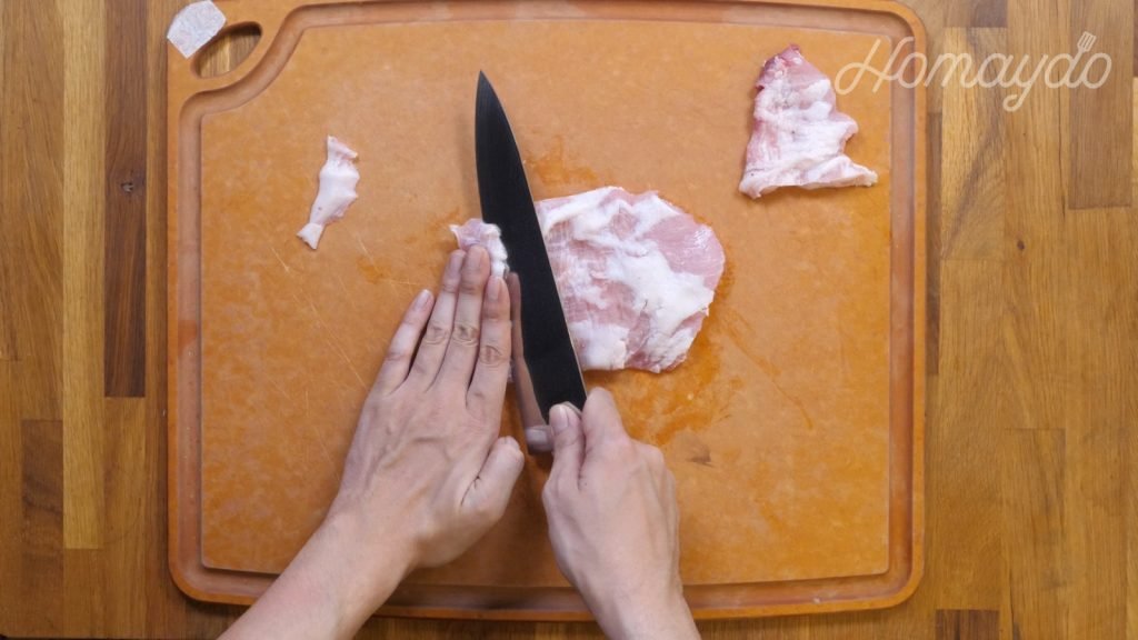 把豬頸肉洗淨,斜刀切成薄片