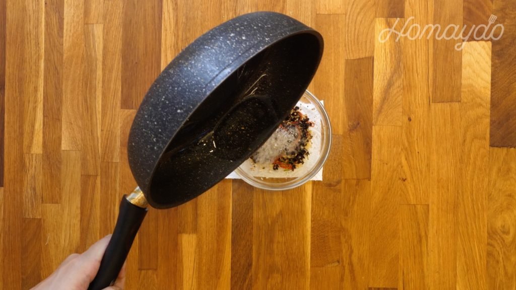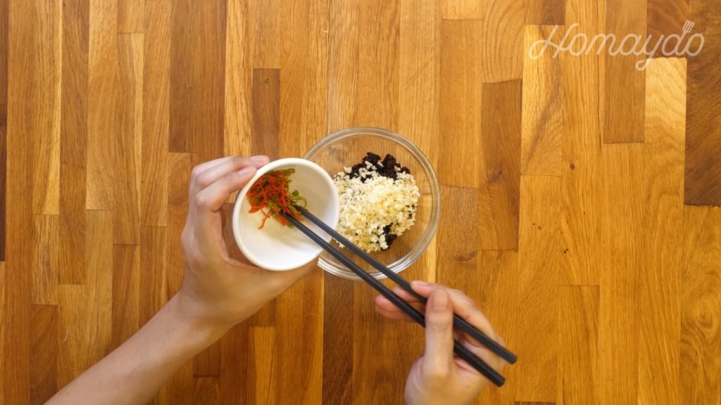 中火起鑊,加入2湯匙的油加熱。在碗內淋上滾油,把材料拌勻