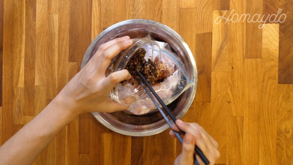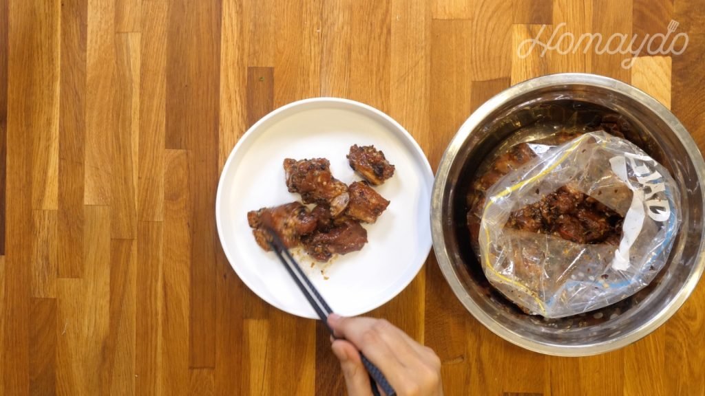 把密實袋放到一隻大碗裡,放入排骨及蒜頭豆豉拌勻。醃15分鐘
