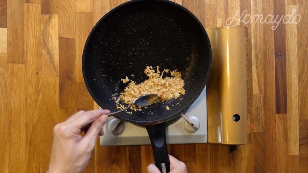 放入蒜頭慢火炸5分鐘,蒜頭變成金黃色時便撈起備用