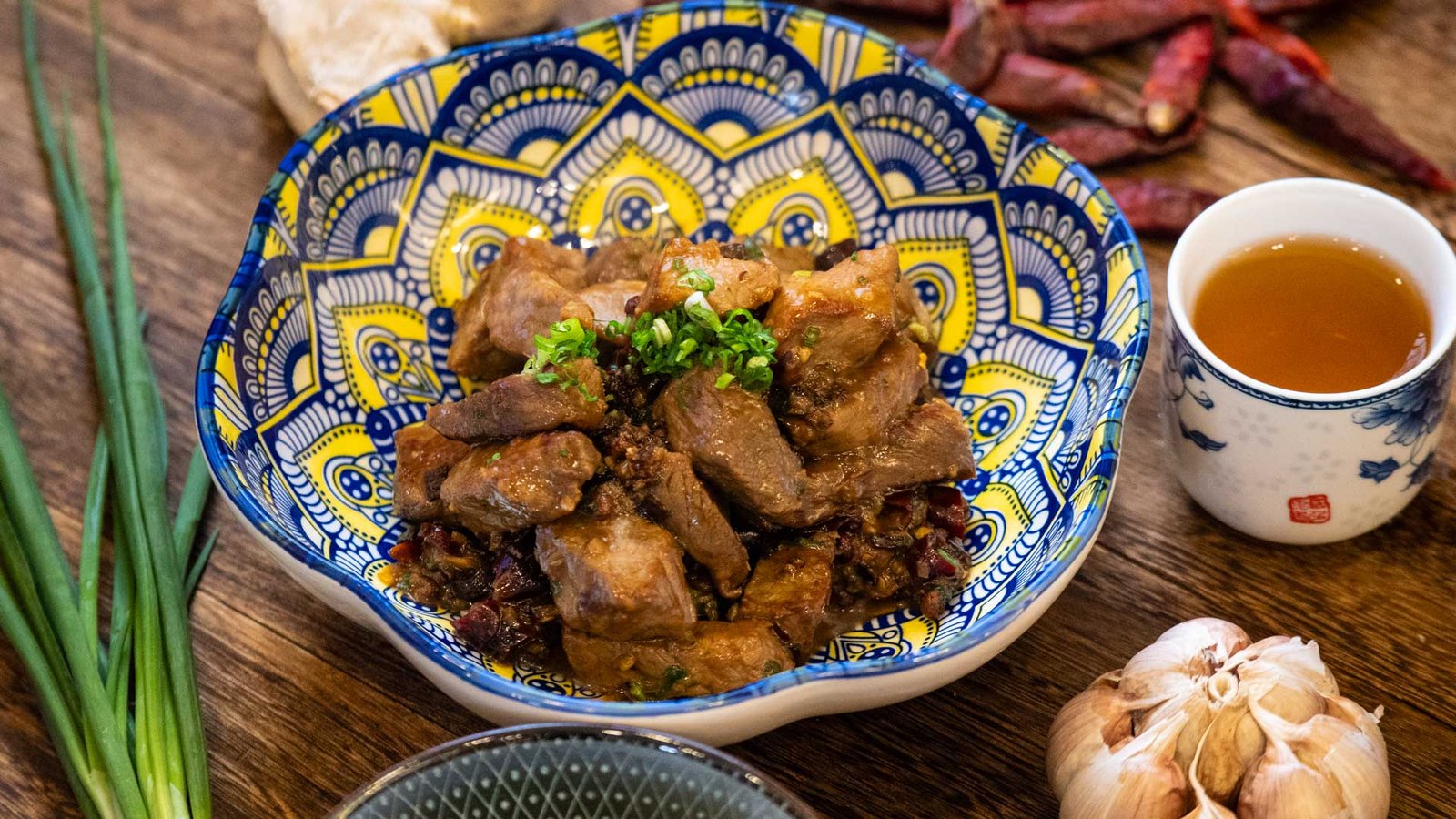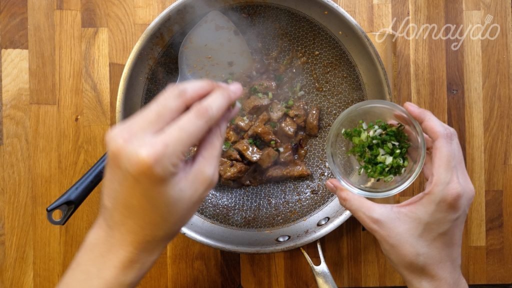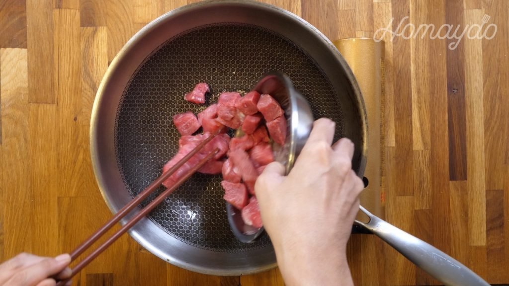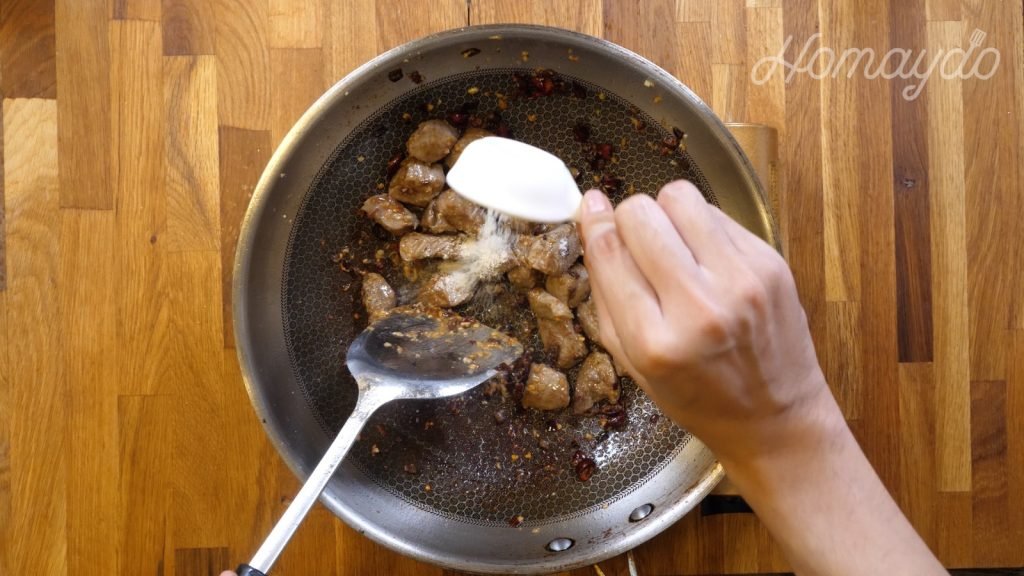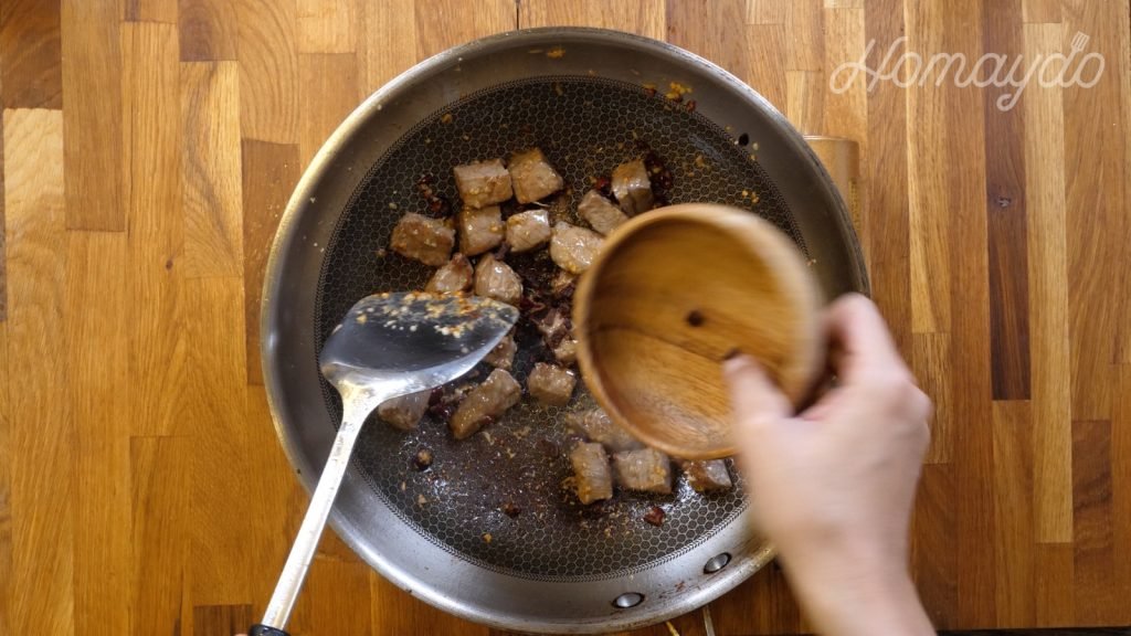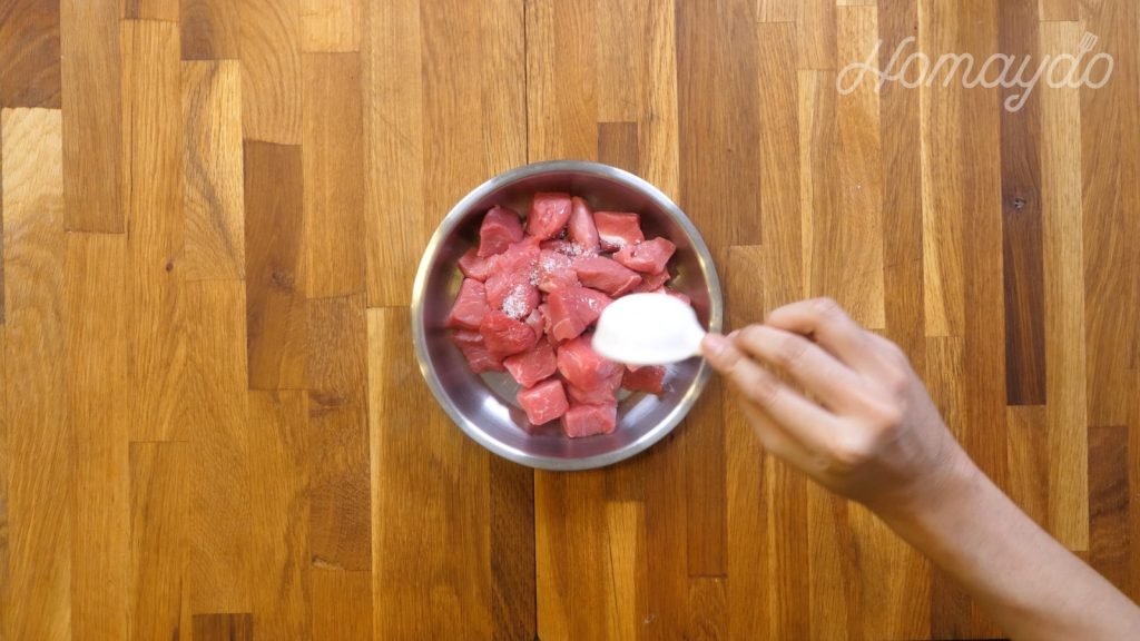 牛肉用米酒、鹽及粟粉拌勻醃15分鐘