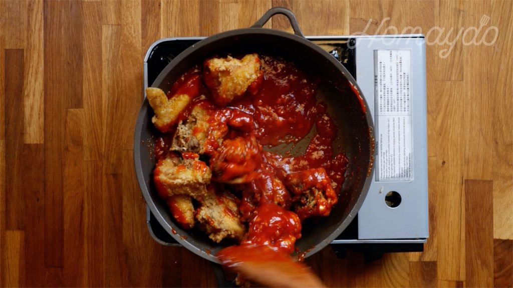就可以放入炸雞,炒至雞件沾滿醬汁就可以上碟