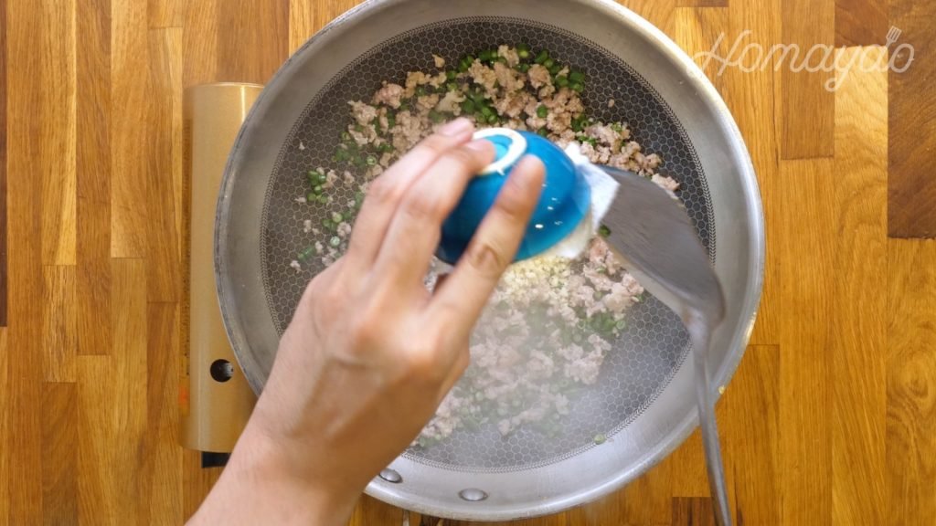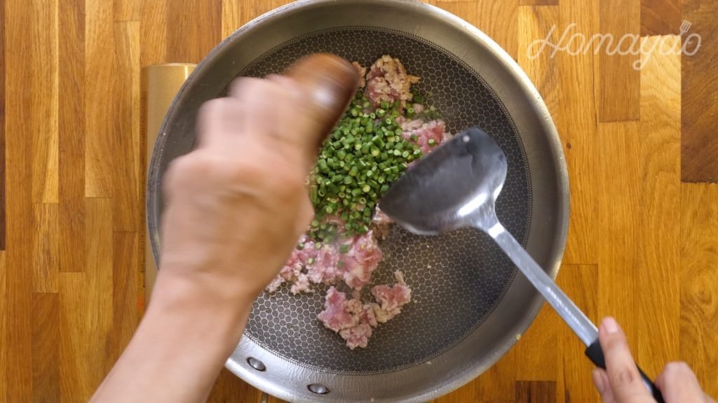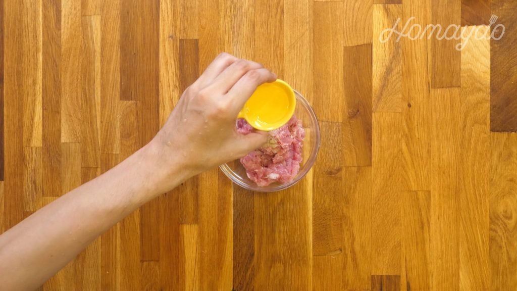 加入鹽、白胡椒粉及油拌勻。醃15分鐘
